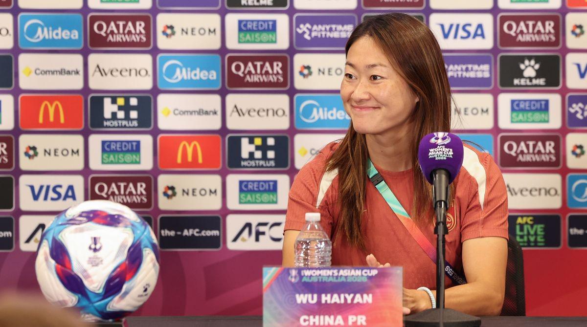 女足亚洲杯首战对阵孟加拉国赛前,中国女足球员吴海燕出席了新闻发布会。